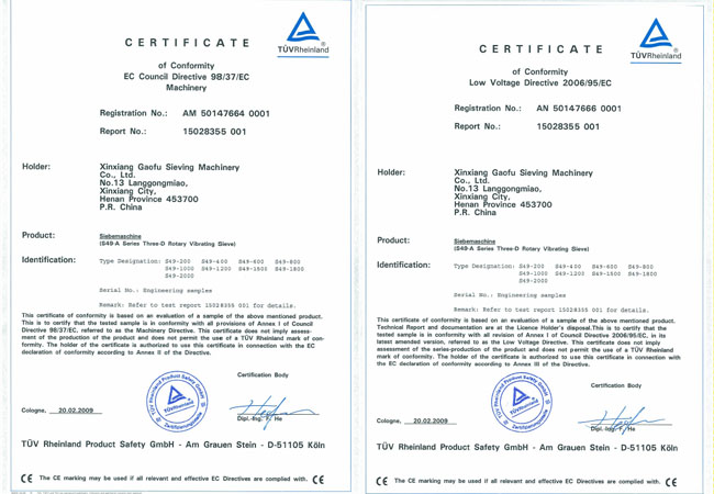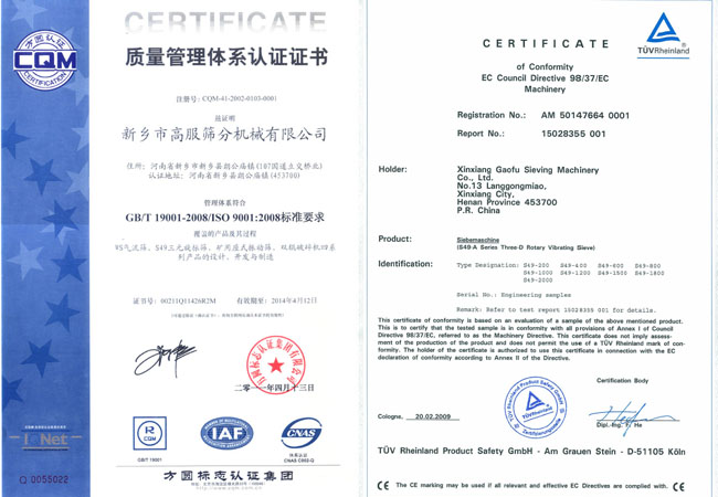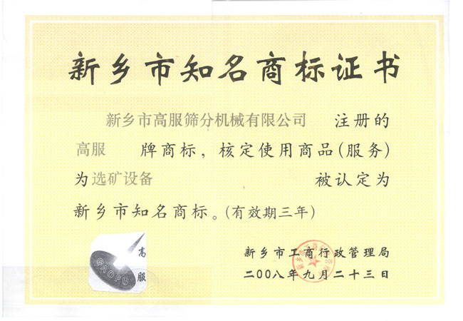 新鄉(xiāng)高服篩分機(jī)械有限公司產(chǎn)品榮譽(yù)證書(shū)